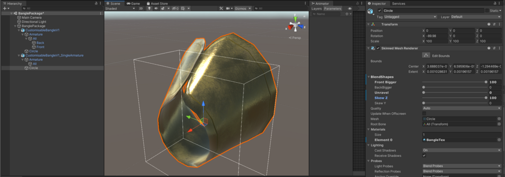 The Unity scene contains two variants of the Bangles; one with a single armature, and one with three armatures to allow for more control over the shape. In addition the Unity package contains the Filamented shader by silent (under the Apache licence) based on Google Filament.
